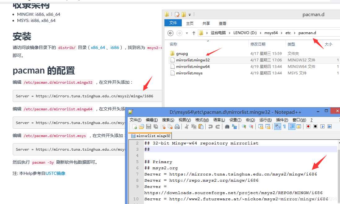 我把msys2安装在D盘的,这三个配置所在的目录是“D:\msys64\etc\pacman.d”,如下修改
