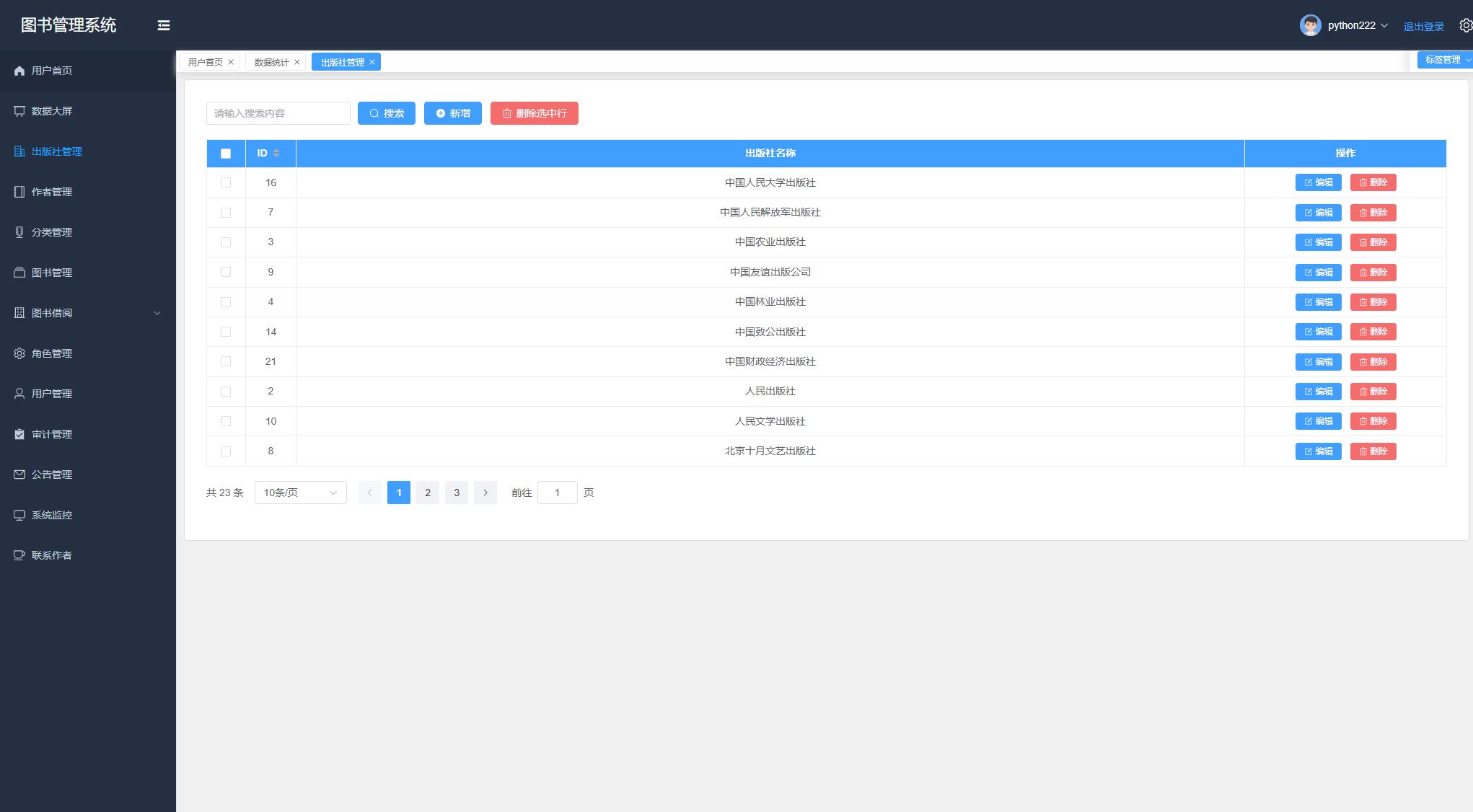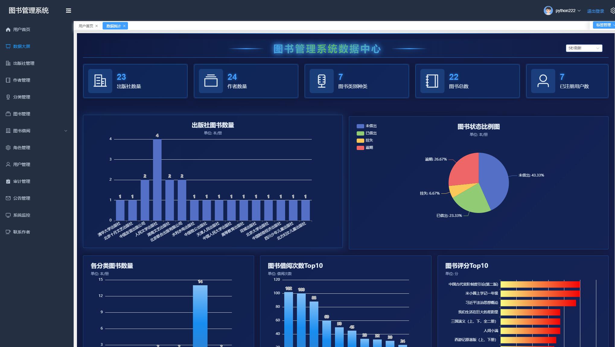 如今社会上各行各业,都在用属于自己专用的软件来进行工作,互联网发展到这个时候,人们已经发现离不开了互联网。互联网的发展,离不开一些新的技术,而新技术的产生往往是为了解决现有问题而产生的。智慧图书管理系统能够实现数据大屏,出版社管理,作者管理,图书管理,图书借阅管理,角色管理,用户管理,公告管理等功能。该系统采用了Mysql数据库,Vue+Python语言前后端分离等技术进行编程实现。