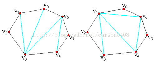 如图所示,用顶点的逆时针序列表示凸多边形,即p={v0,v1,...,vn-1}表示具有n条边的凸多边形。给定凸多边形p,以及定义在由多边形的边和弦组成的三角形上的权函数w。如图所示划分,要求确定该凸多边形的三角剖分,使得该三角形上的劝之和最小。