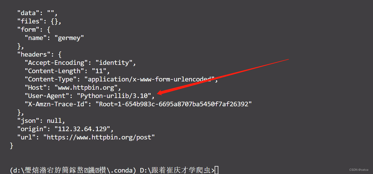 这里我们通过四个参数构造了一个Request类,其中的url即请求的URL,headers中指定了UA和Host,data用了parsel里的urlencode方法和bytes的方法吧字典数据转成字节流格式。另外,指定请求方法为post(注意,这里的url后缀名一点要是/post,不然会报405错误)