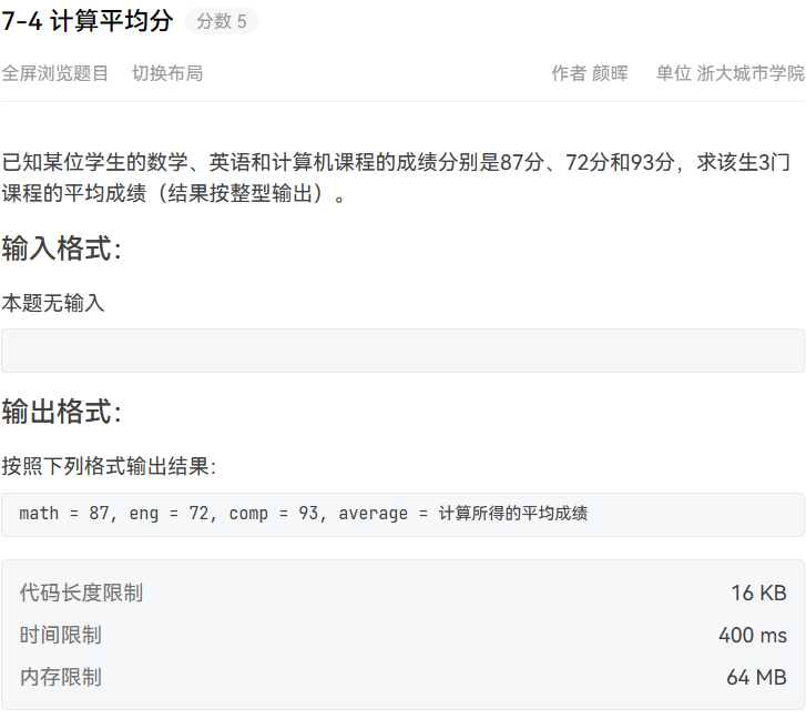 7-4 计算平均分 已知某位学生的数学、英语和计算机课程的成绩分别是87分、72分和93分,求该生3门课程的平均成绩(结果按整型输出)。输入格式:本题无输入输出格式:按照下列格式输出结果:math = 87, eng = 72, comp = 93, average = 计算所得的平均成绩