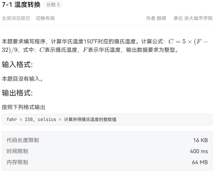 7-1 温度转换 要求编写程序,计算华氏温度150°F对应的摄氏温度。计算公式:C=5×(F−32)/9,式中:C表示摄氏温度,F表示华氏温度,输出数据要求为整型。输入格式:本题目没有输入。输出格式:按照下列格式输出fahr = 150, celsius = 计算所得摄氏温度的整数值