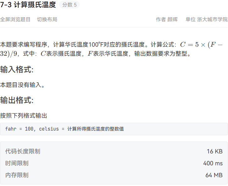 7-3 计算摄氏温度 本题要求编写程序,计算华氏温度100°F对应的摄氏温度。计算公式:C=5×(F−32)/9,式中:C表示摄氏温度,F表示华氏温度,输出数据要求为整型。输入格式:本题目没有输入。输出格式:按照下列格式输出fahr = 100, celsius = 计算所得摄氏温度的整数值
