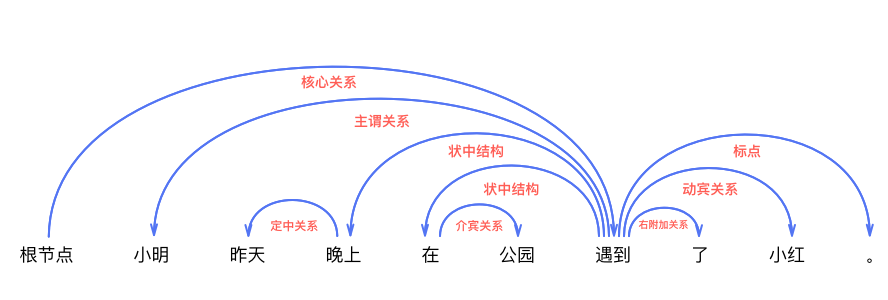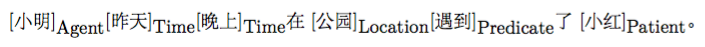 请看下面的例子,“遇到” 是谓词(Predicate,通常简写为“Pred”),“小明”是施事者(Agent),“小红”是受事者(Patient),“昨天” 是事件发生的时间(Time),“公园”是事情发生的地点(Location)。