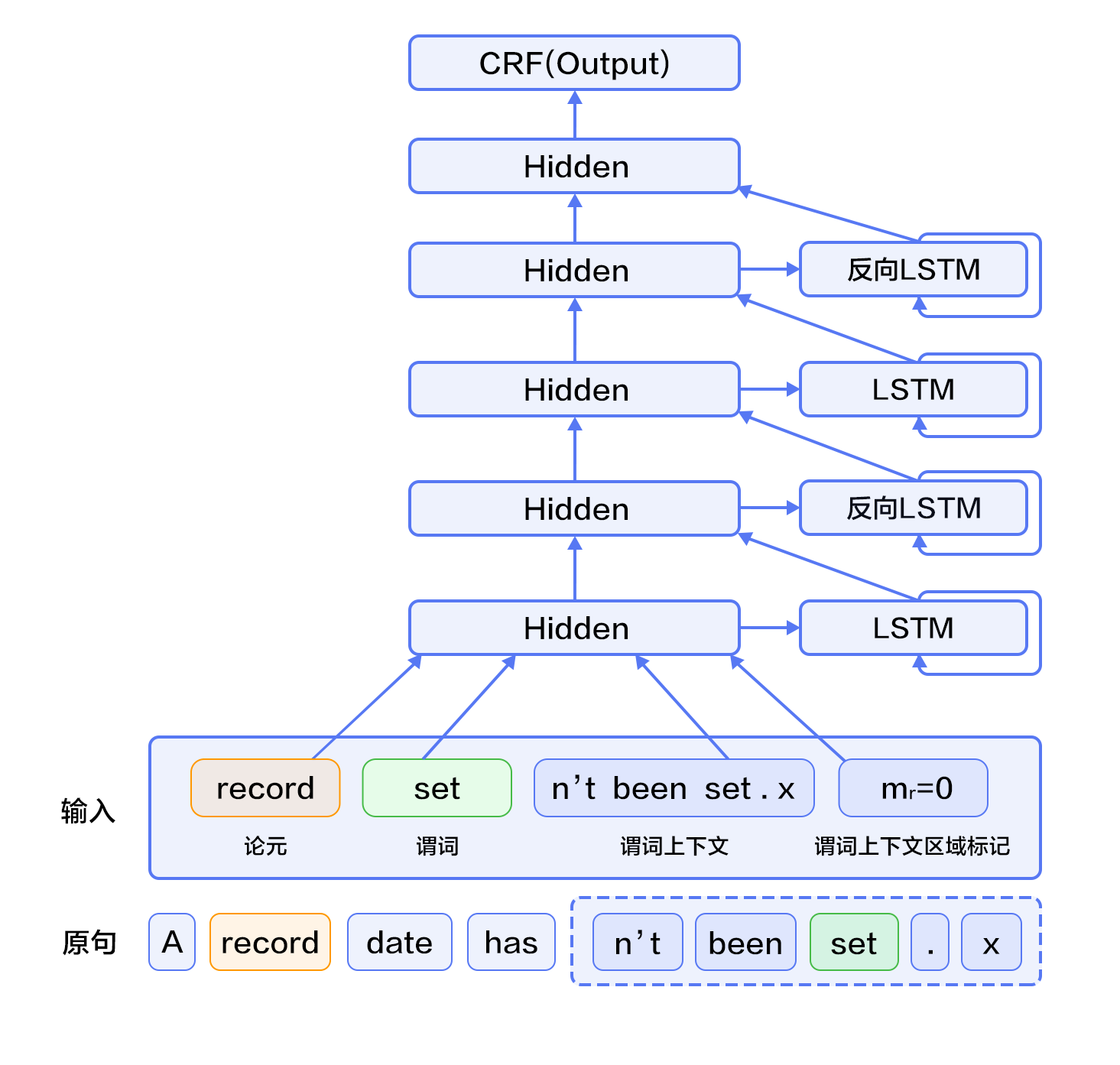 在SRL任务中,深层LSTM网络学习输入的特征表示,条件随机场(Conditional Random Filed, CRF)在特征的基础上完成序列标注,处于整个网络的末端。