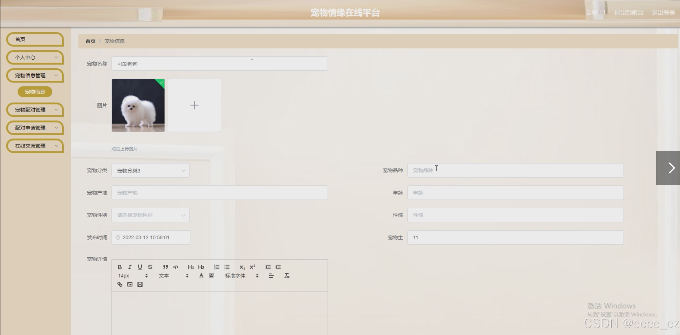 - 宠物信息发布:会员可以发布自己宠物的信息,包括宠物的种类、年龄、性别、照片等。