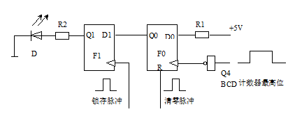 图2-2-7是超量程指示电路的参考方案。该方案的饿设计思想是:当出现超量程时,BCD计数器的最高位输出端Q4就从1变为0,利用Q4的这个下跳边沿,使触发器F0的输出端Q0由0变成1。因此,当锁存脉冲到来时,触发器F1的输出端Q1变成1,使作为超量程指示用的发光二极管亮。