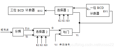 当被测信号频率较低时,为保证测量精度,常采用测周法。即先测出被测信号的周期,再换算成频率。测周法的实质是把被测信号作为闸门信号,在它的高电平的时间内,用一个标准频率的信号源作为计数器的时钟脉冲。若计数结果为N,标准信号频率为f1,则被测信号的周期为