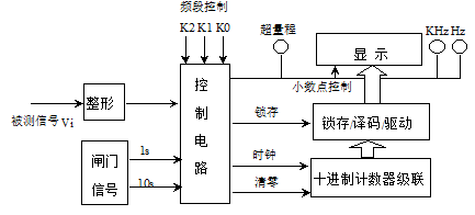 图2-2-3是测频法的参考框图。被测信号为矩形波时,整形电路可省略。对信号的低频段采用闸门信号展宽的方法,因此分别采用1秒和10秒两个闸门信号,频段控制可以采用三位(K2、K1、K0)或二位控制信号。在测量过程中,由于计数器的输出总是不断变化的,如果这时译码器实时地将计数值译码,显示器就会不断地跳动,无法读数;或者跳动太快,由于人地视觉残留,看起来显示器总是显示8。为了在测量过程中能稳定清晰地显示数码,译码器必须具有锁存功能。