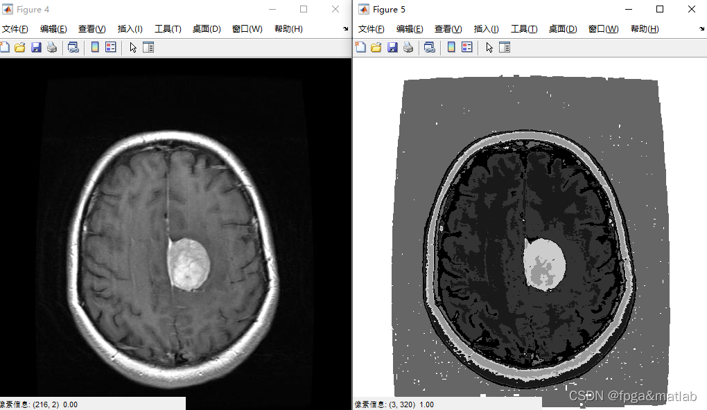 该博客介绍了如何利用Matlab进行Fuzzy C-means(FCM)聚类,将两种不同的医学图像(GADO和AXIAL FLAIR)作为输入进行图像分割。通过调整像素值,将像素分配到7个不同的类别中,最终生成一个新的融合图像。这个过程对于医学影像分析和图像处理研究具有重要意义。