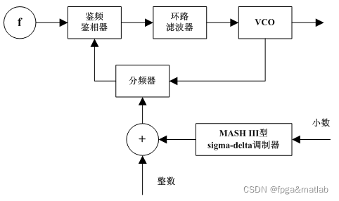 这里,基于小数分频的频率合成器,考虑到你需要实现sigma-delta以及mash等结构。因此,系统的模块结构如下图所示: