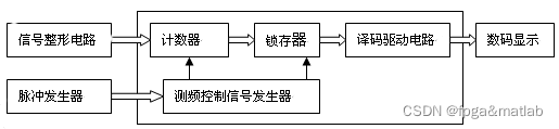 数字频率计的关键组成部分包括一个测频控制信号发生器、一个计数器和一个锁存器,另外包含信号整形电路、脉冲发生器、译码驱动电路和显示电路,其原理框图如图1所示。