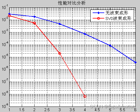 以非规则LDPC编码,在协作MIMO系统中,中继节点以放大转发协议处理信号,在中继接收源端信号与转发到目的节点时,这两过程中加上波束成形技术,与没有加上波束成形技术的系统比较,做出误码率曲线图(2个源节点,4个中继节点,2个目的节点)(波束成形算法使用SVD方法,即对信道矩阵进行奇异值分解)