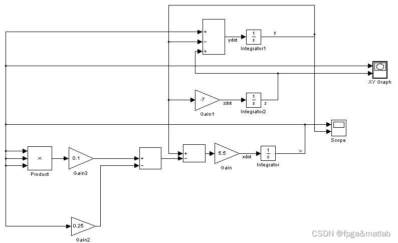 这里信号的增益设置为0.1,即将信号的幅度乘以0.1后作为信号的输出。这里我们用到了多个信号增益模块,主要有0.1增益,0.25增益,5.5增益和-7增益。