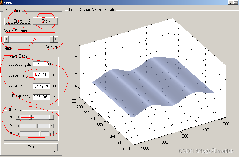 5这里是3D效果的显示,可以从不同的角度进行观察海浪(MATLAB中GUI的AXIS无法直接用鼠标旋转进行三维显示,所以需要通过这个功能进行显示)