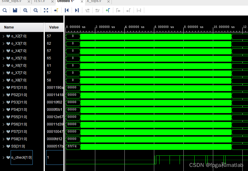 FPGA教程目录 MATLAB教程目录 本课程成果预览(o_check=0表示分类1,o_check=1表示分类2,识别率为98.7%) 目录 1.软件版本 2.SVM的FPGA实现准备 3.Verilog实现 3.1 基于ROM核的测试数据模块设计 3.2 基于乘法IP核的乘法器谁 3.3加法器设计 3.4判决输出模块 3.5顶层SVM模块 3.6testbench模块 4.FPGA仿真 1.软件版本 vivado2019.2/MATLAB2021a