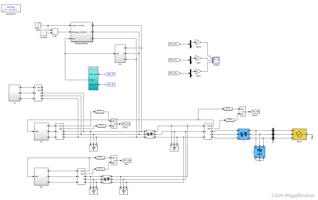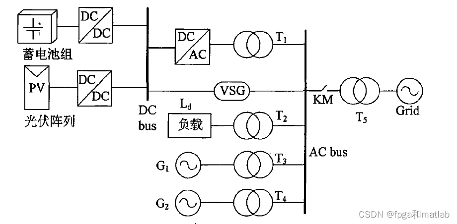 可以看到,整个系统包括蓄电池,光伏阵列,VSG,负载,以及两个电机,根据这些信息,我们进行建模。