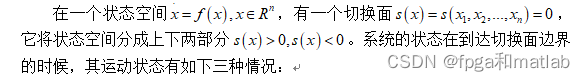 滑膜控制是一种变结构控制策略,其和常规控制方法的主要区别在于控制的不连续性,即一种使系统结构随时间变化的开关特性。所以,滑膜控制器也叫做变结构控制器,其本质是一类特殊的非线性控制器,并且这种非线性为不连续性。滑膜控制器和其他控制方式最大的区别在于其结构的不固定性,在其工作过程中,系统当前的状态会发生变化,使得系统按照预先设置的“滑动模态”的状态轨迹运动。正是由于这个特点,滑膜控制器具有快速响应的优点。滑模控制的基本定义如下所示: