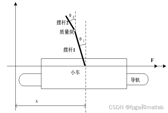 系统结构: 二级倒立摆系统由两个摆杆和两个关节连接的小车组成。摆杆可以在关节处旋转,而小车可以在线性轨道上移动。摆杆的角度和小车的位置是系统的状态变量,控制的目标是使得摆杆保持竖直,从而实现稳定的控制。