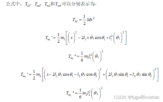 系统动力学: 二级倒立摆的动力学是高度非线性的,可以使用物理公式和动力学方程来描述。这些方程涉及到摆杆的质量、长度、摩擦等参数,以及小车的质量、加速度等参数。系统的动力学可以用微分方程组表示。