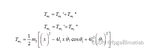 直线型二级倒立摆主要由小车,轨道线路以及两个倒立摆构成。对于二级倒立摆的控制需要根据摆体位置、摆体速度、1号摆杆的坐标、1号摆杆的速度、2号摆杆的坐标、2号摆杆的速度六个参数决定的。假设倒立摆系统中小车的质量为M;1号摆杆的质量为m1;摆杆2的质量为m2;质量块的质量为m3;那么根据二阶倒立摆的拉格朗日计算公式可知:
