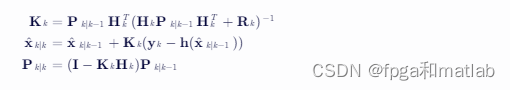 其中,Kk 是卡尔曼增益,x^k∣k 是状态向量的更新值,Pk∣k 是协方差矩阵的更新值,Rk 是观测噪声的协方差矩阵。