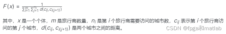 适应度评估:定义适应度函数来评估每个个体(即解)的质量,通常为所有旅行商路径长度之和的倒数: