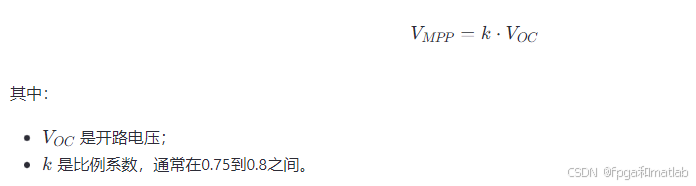 恒定电压跟踪法基于光伏阵列在最大功率点时的电压与开路电压之间的固定比例关系。这种方法简单,但精度较低。其数学模型为: