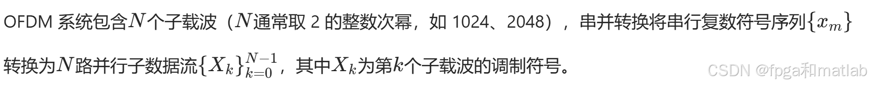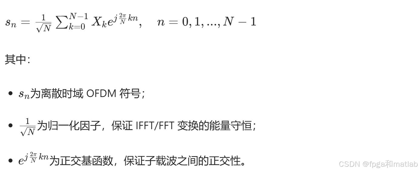 IFFT是OFDM调制的核心步骤,其作用是将频域的子载波符号转换为时域的OFDM符号。对于N点IFFT,时域信号{s(t)}的离散形式为: