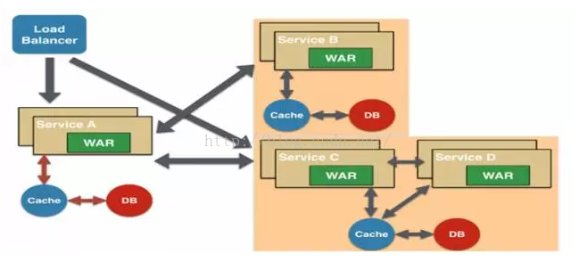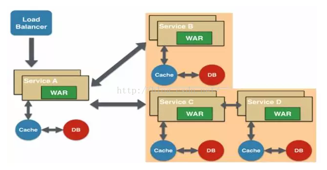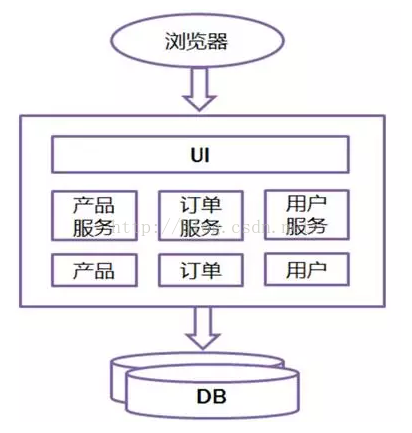 所有的功能打包在一个 WAR包里,基本没有外部依赖(除了容器),部署在一个JEE容器(Tomcat,JBoss,WebLogic)里,包含了 DO/DAO,Service,UI等所有逻辑。