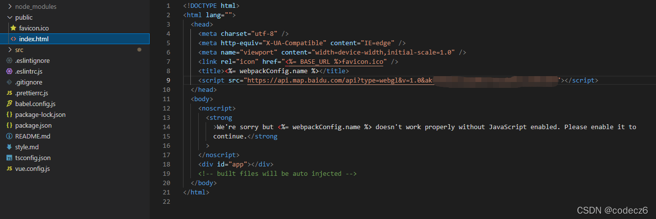 第一步:在 public的index.html中引入百度地图api,ak需要在百度开放平台申请