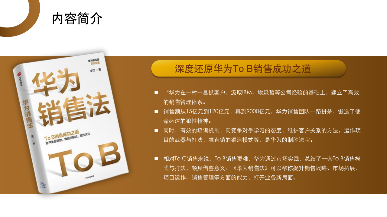 适应人群为 ToB 销售从业者、销售团队管理者、企业营销负责人及渠道合作伙伴。主要内容围绕华为 ToB 销售方法,涵盖战略规划(5 步规划法、向竞争对手学习策略)、市场拓展(5 看洞察法、8 大拓展技巧)、客户关系管理(分层级维护、发展线人方法)、项目运作(6 阶段流程、7 种营销工具)、渠道模式(准直销模式及代理商管理)、团队管理(狼性团队打造 6 要素、销售管理部职能),解析从线索到回款全流程,为 ToB 销售提供实战策略与管理方案。