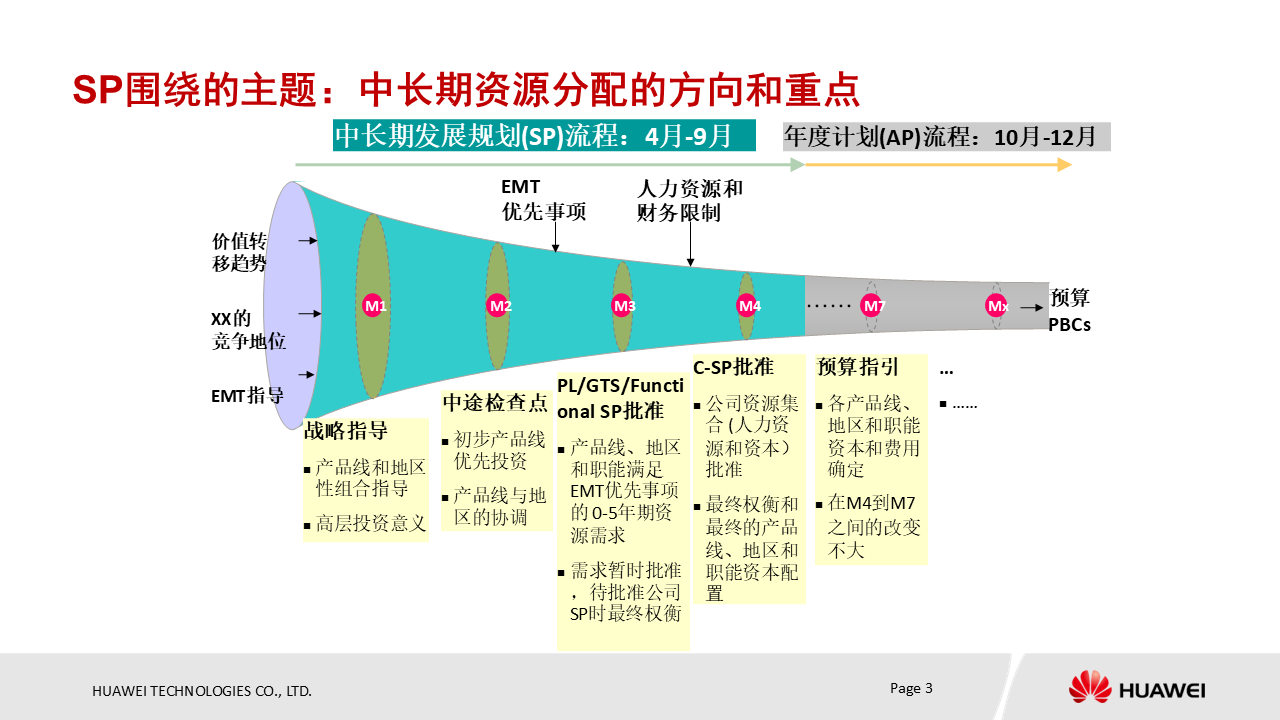 该方案适配企业高管、战略规划负责人、业务部门管理者及运营团队,尤其适合需建立规范战略与业务计划体系的大中型企业。核心拆解华为 SP(战略规划)与 BP(业务计划)全流程,以 “中长期资源分配 + 年度目标落地” 为双核心,构建从战略方向制定、业务设计、资源配置到绩效解码的闭环体系。SP 聚焦 4-9 月中长期规划,明确市场趋势分析、业务组合优先级、资源分配方向;BP 聚焦 10-12 月年度执行,细化 KPI、财务预算、行动计划等落地内容。配套价值树、战略解码等工具,打通从公司战略到部门目标、个人 PBC 的逐层分解,强化跨部门协同与过程管控,助力企业实现战略落地、资源优化与绩效达成。