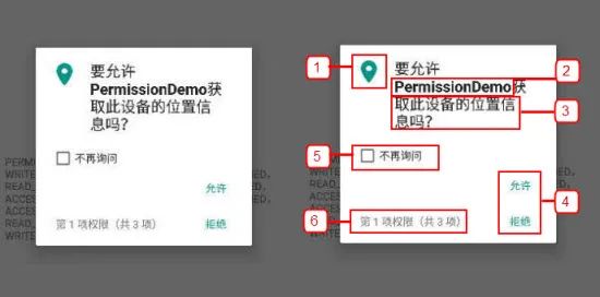 - 权限组icon1. App名称1. 申请的权限1. 允许、拒绝 操作1. 不再询问选项1. 多弹窗索引