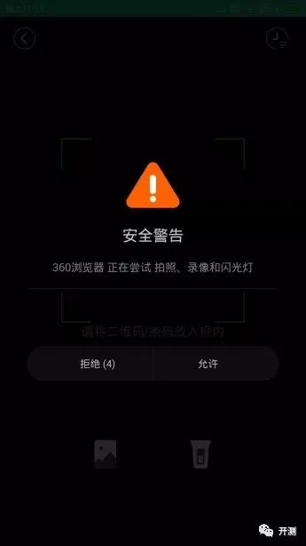 例:HTC T328 Android 4.0.2系统。浏览器扫码功能触发相机调用时,360手机卫士会弹出权限提示窗,用户可以允许或拒绝授权。注意,此窗由第三方安全软件弹出,非系统级弹窗,跟后面要说的两种弹窗有所区别。