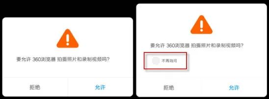 关于权限弹窗,针对同一个App的同一个权限,有时弹窗不带“拒绝&不再询问”选项,有时带此选项。如下图是谷歌原生系统、小米MIUI系统的两种弹窗对比。这是什么原因呢?Android原生实现:App全新安装后首次申请权限,弹窗不带此选项,即图左效果。当用户拒绝授权后,App下次再申请该权限时,则带此选项,即图右效果。但是,国内部分手机厂商并未遵循此标准,比如华为的Android 10之前的系统、OPPO/VIVO的部分权限,授权弹窗不管是否首次,都带此选项。此为系统行为,App无法决定。