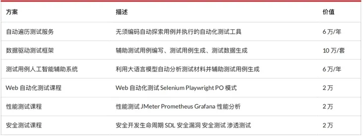 测试效能提升礼包包含:自动遍历测试服务、数据驱动测试框架、测试用例人工智能辅助系统、Web 自动化测试课程、性能测试课程、安全测试课程。