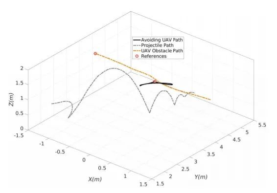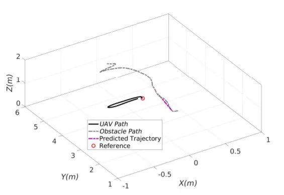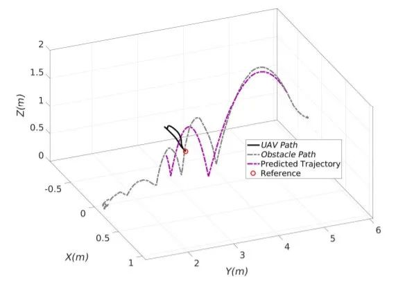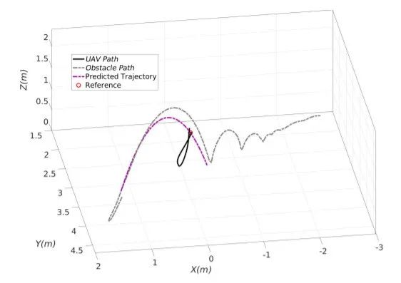 在保持与缓慢移动的障碍物的距离的同时,这两种方法都无法避免与弹丸障碍物发生碰撞,障碍物进入影响区域的时间很短, 这些控制器直到与无人机发生碰撞,才能及时避开,而且这些控制器也不知道障碍物的未来位置在哪里,因此,它们的避让动作可能会使它们沿着障碍物的轨迹移动。