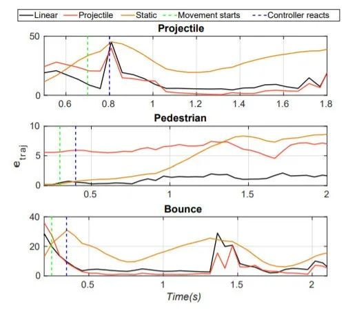 如图,投掷障碍物的时间约为0.25 s,而控制器的反应速度为0.35 s。这表明即使是简化的轨迹模型也仍然可以对障碍物路径做出足够好的预测,尤其是在增加沿预测的安全半径。