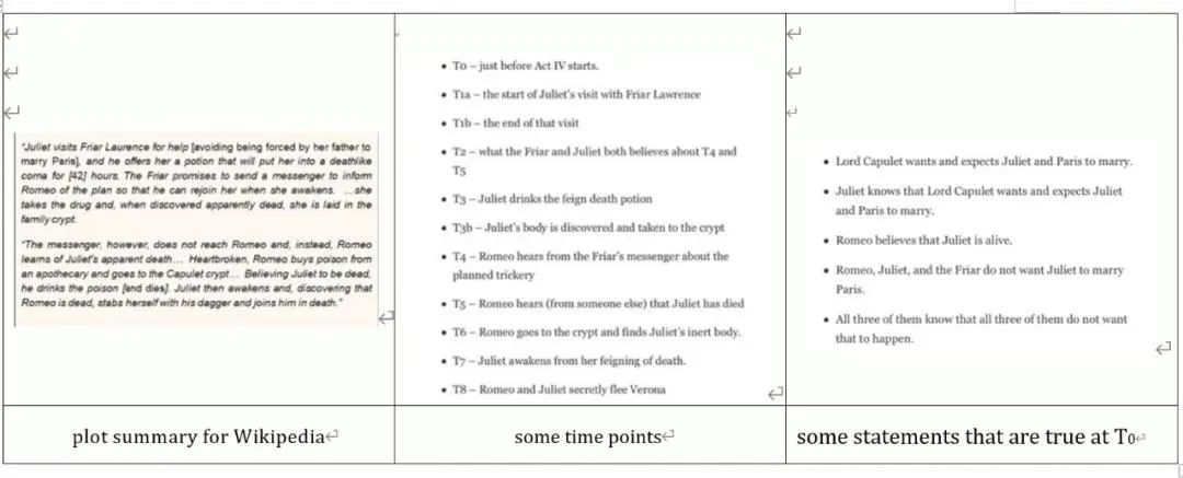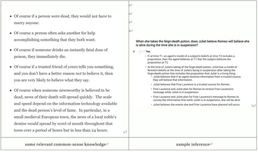 正如我们在第4.3节中看到的罗密欧和朱丽叶的例子,CYC是非常好的,因为它可以(至少在一些非琐碎的程度上)超过认知模型的推理(例如它的时间点列表和关于在不同时间点已知的人物和地点的事实,节选于图2),与背景(常识知识)相关,但仍然存在着可悲的缺陷,因为它无法单独推导出相关的认知模型。任何一个系统,如果能够将自然语言维基百科的绘图摘要(如图2左面板中的一个)作为输入,并自动导出自己的详细认知模型(类似于CYC的程序员手工构建的模型),这样下游的推理者就可以对其进行推理,这将是相对于传统推理的一个重大进步当前AI。