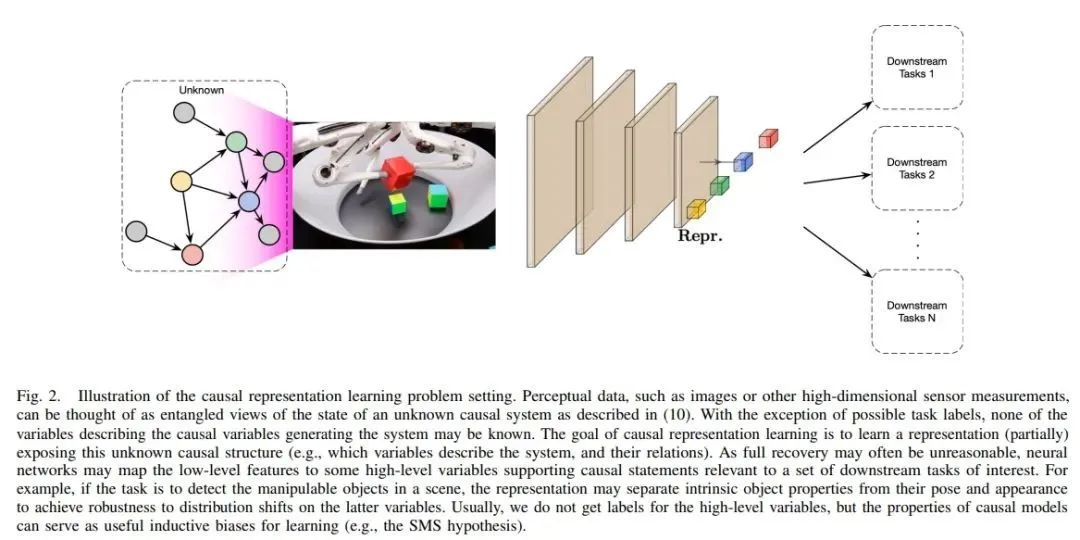 其中 G 是非线性函数。下图 2 展示了一个示例,其中高维观测是对因果系统状态进行查看的结果,然后利用神经网络对其进行处理,以提取在多种任务上有用的高级变量。