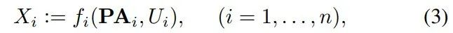 SCM 考虑与有向无环图(directed acyclic graph, DAG)的顶点相关的一组观测值(或变量)X_1, . . . , X_n。该研究假设每个观测值根据以下公式得出: