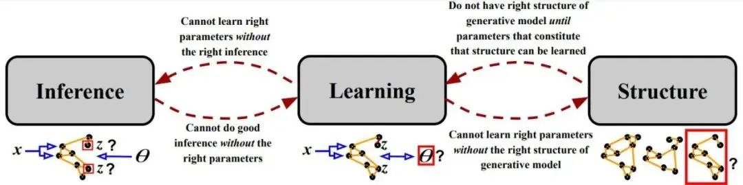 图6:支撑人类计算的概念之间的关系:1)推理,2)学习,3)结构的选择。红色方框突出显示感兴趣/正在讨论的特定对象(方框旁边的问号表示特定时间范围内试图回答/优化的目标或问题)。