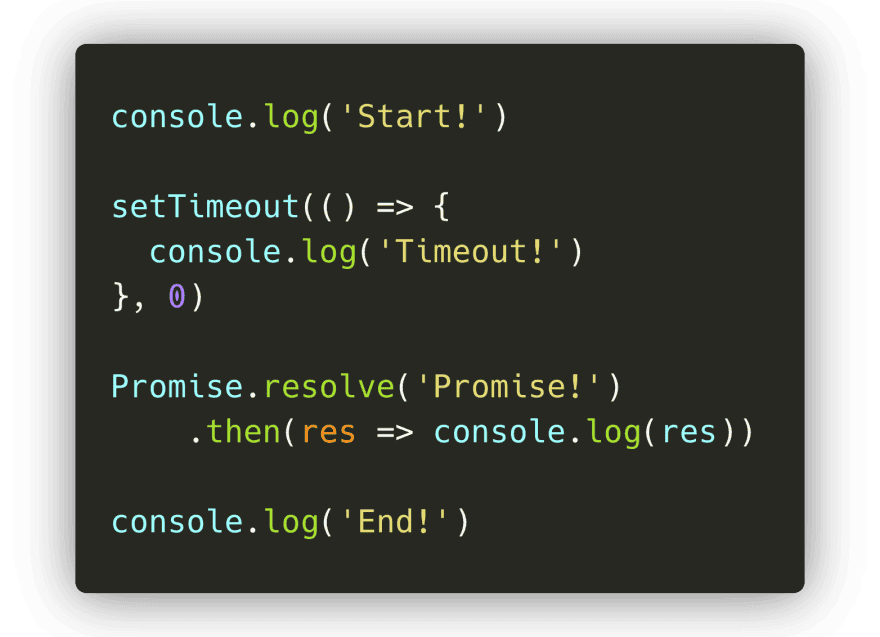 然而,第二个被打印的值是 End!,并不是 promise 被解决的值!只有在 End! 被打印之后,promise 的值才会被打印。