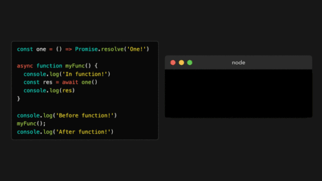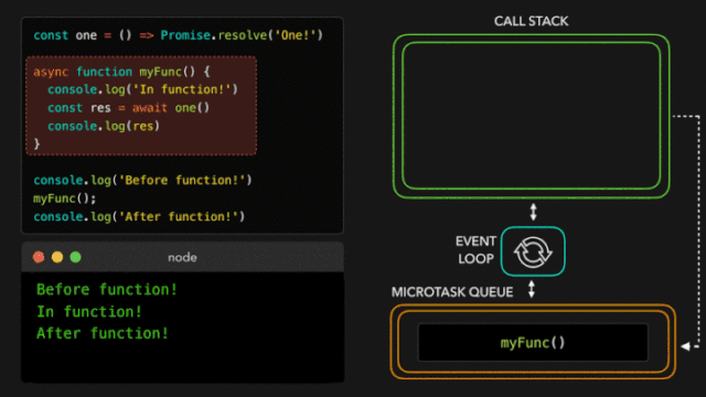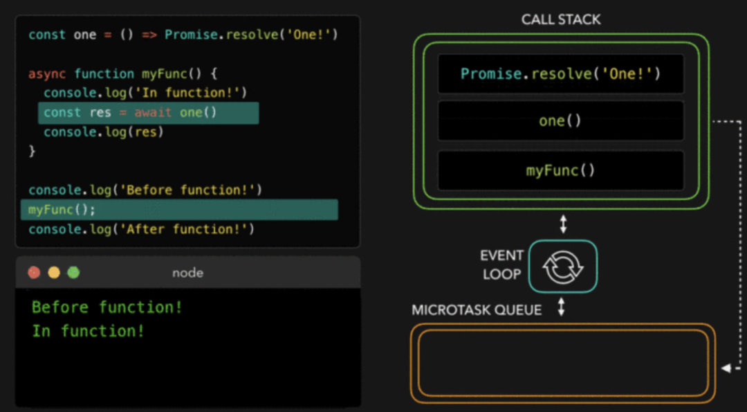 最终,没有更多的任务在全局执行上下文中运行!事件循环检查看看是否有任何的微任务在排队:是的,有!在解决了one的值以后,异步函数myFunc开始排队。myFunc被弹入调用栈中,在它之前中断的地方继续运行。