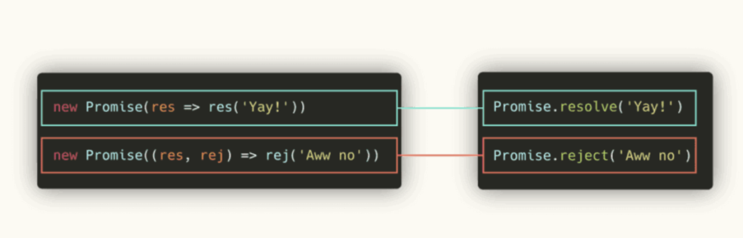 顺便提醒一下,当你知道一个 promise 总是 resolve 或者总是 reject 的时候,你可以写 Promise.resolve 或 Promise.reject,传入你想要 reject 或 resolve 的 promise 的值。