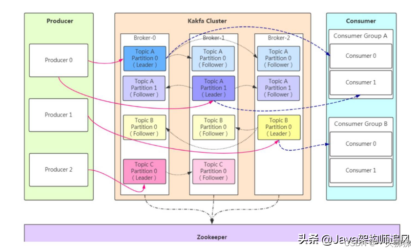 Partition:为了实现扩展性,提高并发能力,一个Topic 以多个Partition的方式分布到多个 Broker上,每个 Partition 是一个 有序的队列。一个 Topic 的每个Partition都有若干个副本(Replica),一个Leader 和若干个 Follower。生产者发送数据的对象,以及消费者消费数据的对象,都是 Leader。Follower负责实时从 Leader 中同步数据,保持和 Leader 数据的同步。Leader 发生故障时,某个Follower 还会成为新的 Leader。