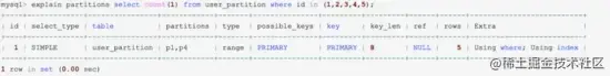 用户的SQL语句是需要针对分区表做优化,SQL条件中要带上分区条件的列,从而使查询定位到少量的分区上,否则就会扫描全部分区,可以通过 EXPLAIN PARTITIONS 来查看某条SQL语句会落在那些分区上,从而进行SQL优化,如下图5条记录落在两个分区上: