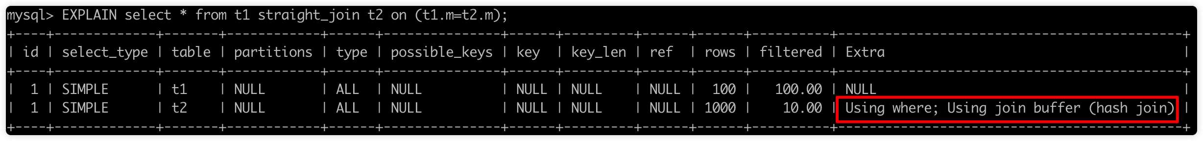 SELECT * FROM t1 STRAIGHT_JOIN t2 ON t1.m = t2.m;