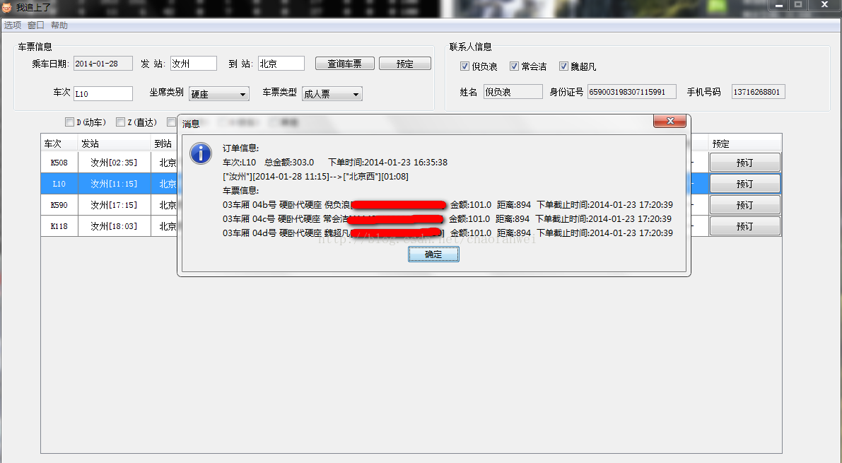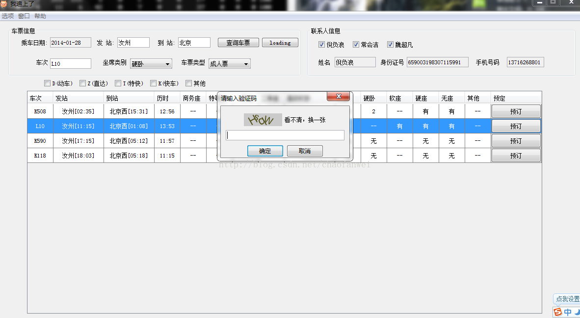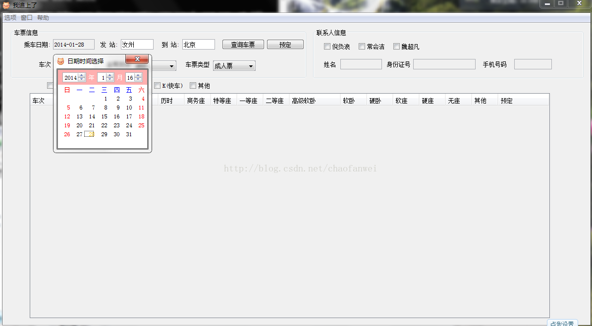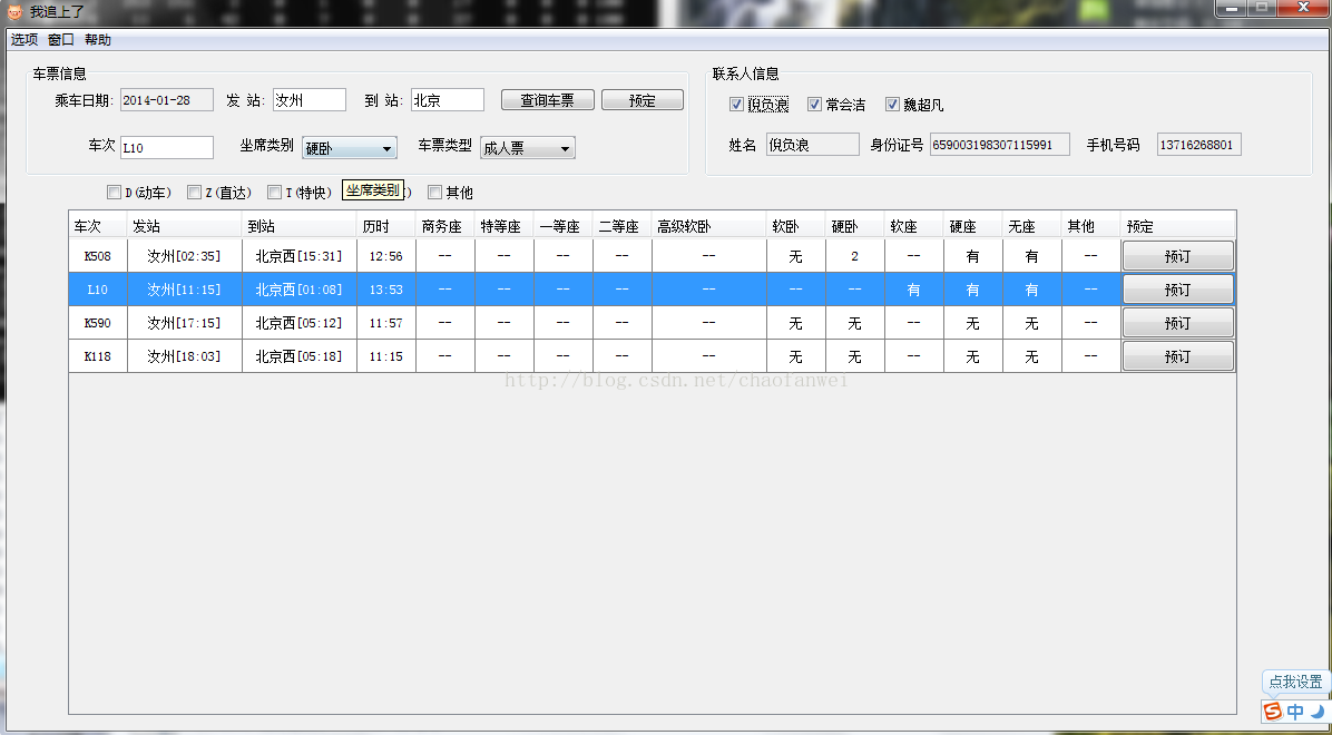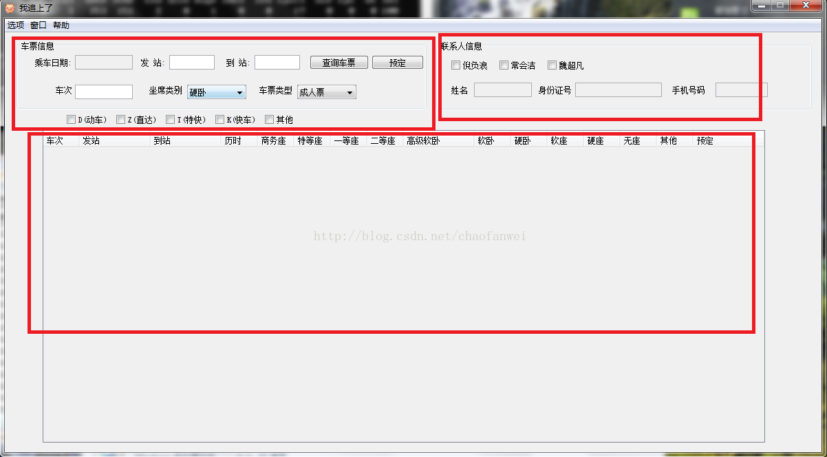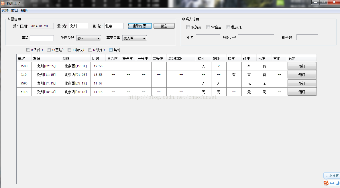 目前有2个主界面,一个是手动查询订票,一个自动查询订票,先看手动查询主界面,主要分3个部分,其中右上角的联系人是 通过程序获得的看图2。